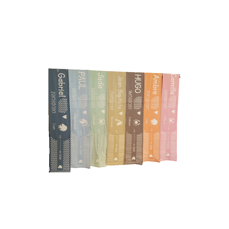 Nouvelle écharpe dans notre gamme de cadeau de naissance. Vous y trouverez en plus du prénom et de la date de naissance, le signe de zodiac de l'enfant. Une personnalisation qui permet toujours d'avoir des discussions.